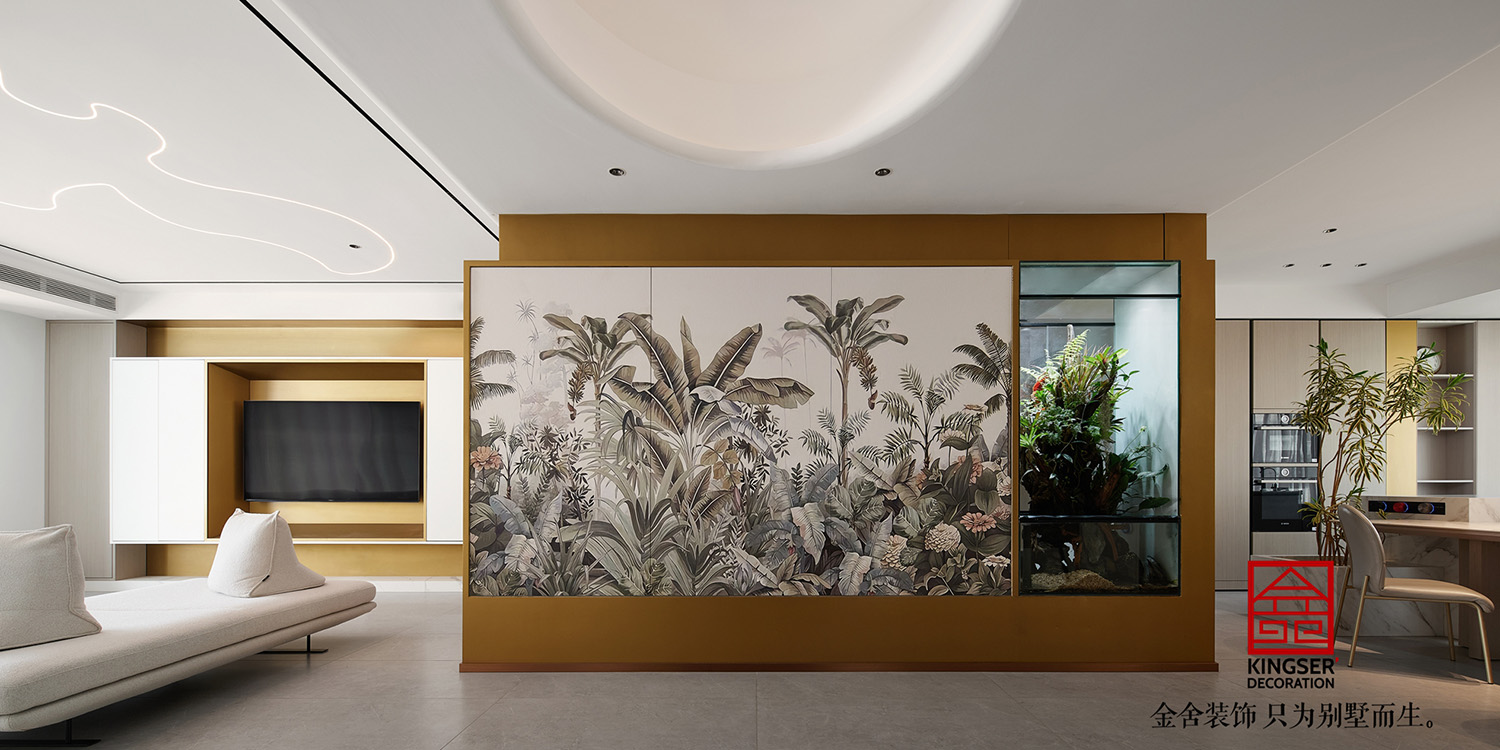 褪去城市繁冗華麗的外殼,回歸至與人的內(nèi)在共鳴,斑駁的光影在客廳空間徜徉,大理石與墻板的搭配,釋放出一種優(yōu)雅、沉靜及治愈的氛圍感,貫穿于整個(gè)別墅裝修空間的動(dòng)線。